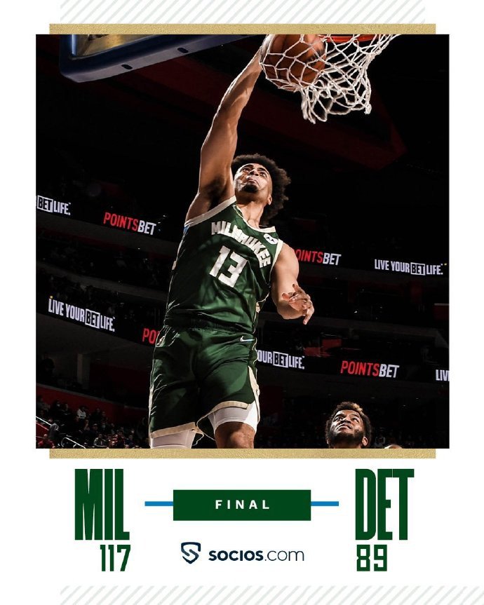 雄鹿(4-4):字母哥28分8篮板9助攻4帽,康诺顿16分3篮板2助攻2断,字母哥哥9分8篮板2断,希尔4分5篮板7助攻,格雷森-阿伦8分3篮板,奥杰莱4分5篮板,马穆克拉什维利5分,沃拉16分4篮板3助攻,波蒂斯12分8篮板,胡德4分4篮板,贾斯丁-罗宾逊11分3篮板4助攻