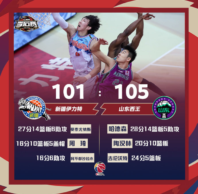 新疆:莫泰尤纳斯27分14板6助3断、周琦16分10板、曾令旭7分10助、唐才育10分、阿不都14分4板6助、于德豪14分4板