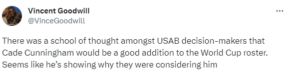 NBA记者Vincent Goodwill表示美国男篮的决策者中有一种观点认为,坎宁安将成为世界杯名单中的一个很好的补充,似乎他正在表明他们为什么考虑他。