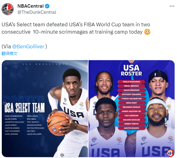 来源:24直播网08-05 09:4024直播网讯08月05日,美国男篮世界杯正牌军输给了陪练队,而且连续两次输球,据记者Ben Golliver报道,美国男篮世界杯正赛球队连续2场在每场10分钟的对抗赛中输给了陪练队,陪练队的坎宁安表现最出色,名记透露他有望进入世界杯大名单。