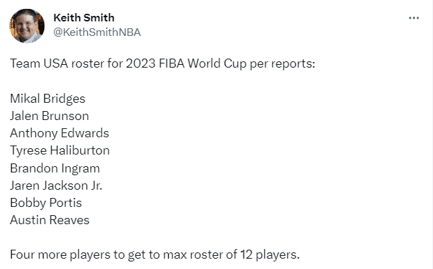 NBA名记Keith Smith表示美国队12人大名单仅剩4个席位。