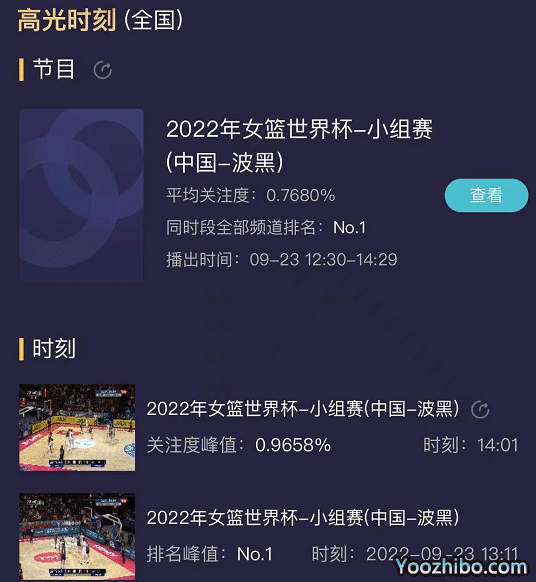 中国女篮场内外都是双赢的状态,赛场上两战净胜110分+力压美国队位居第一,场外的收视率飙升,这场和波黑女篮的比赛是在周五的中午进行,即便是工作日,收视率依旧很高。根据数据显示,这场比赛巅峰时刻的收视率接近1%,为0.9658%,平均收视率更是高达07680%,两项数据均为同时间段的全国第一名,相比起昨天大胜韩国队,收视率提升明显。
