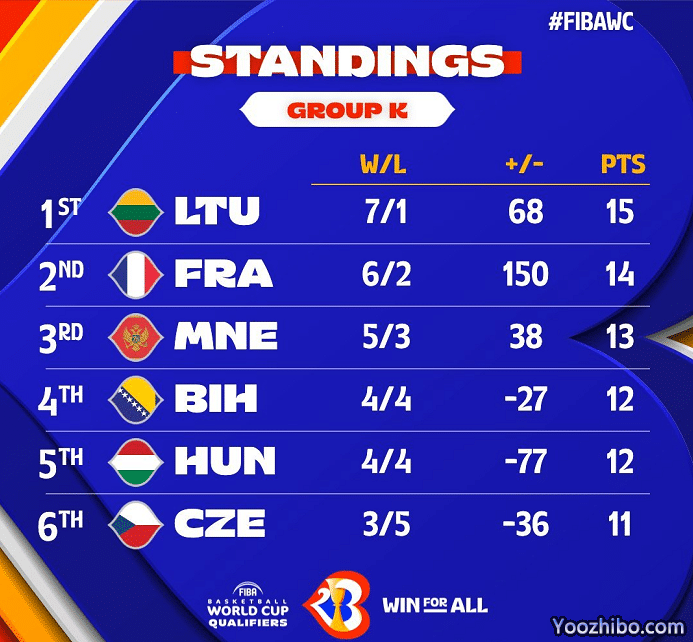 K组:立陶宛队整体的表现依旧很强势,他们目前以7胜1负的傲人战绩排名小组第一,晋级希望大增。法国队6胜2负紧跟其后。