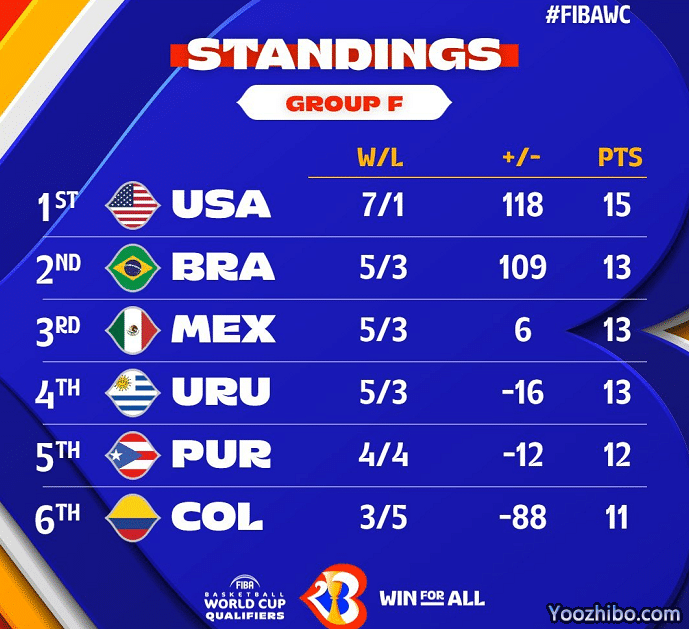 美国男篮的战绩是7胜1负,积分15分,目前他们以2分优势领先,其余五队均有出线的可能,小组赛的竞争是非常激烈的。