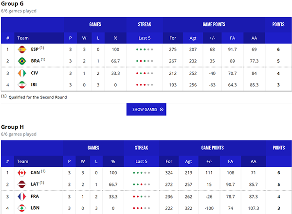 GH组的西班牙、巴西、加拿大队和拉脱维亚从小组赛顺利突围,西班牙和加拿大队都是全胜的状态,表现强势。科特迪瓦、伊朗、法国和黎巴嫩出局,其中多位巨星压阵的法国男篮被淘汰,爆出世界杯的最大冷门。