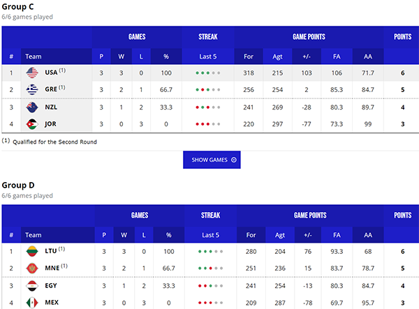 CD组晋级的是美国、希腊、立陶宛和黑山,其中美国男篮和立陶宛在小组赛是全胜的状态,表现强势。美国队是夺冠大热门,立陶宛也是传统强队。这两个小组出局的是新西兰、约旦、埃及和墨西哥。