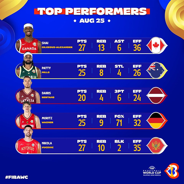 FIBA官宣今年世界杯揭幕日的最佳球员:亚历山大(加拿大)、米尔斯(澳大利亚)、大贝尔坦斯(拉脱维亚)、大瓦格纳(德国)和武切维奇(黑山)。