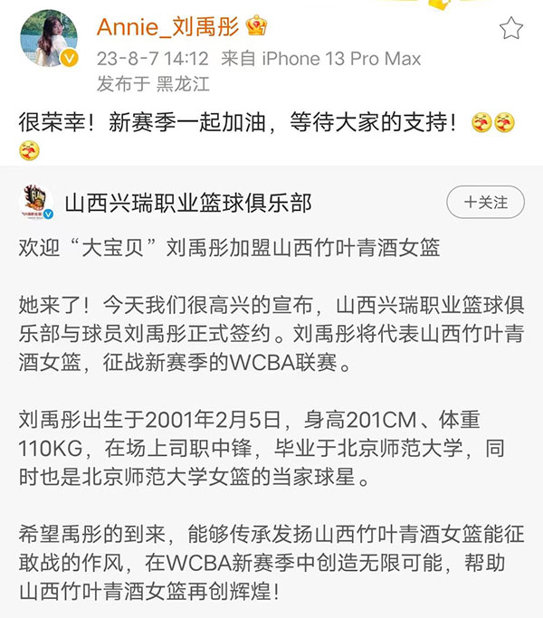 所幸的是8月7日的14时,刘禹彤这边也是在社交媒体上官宣了自己的去向。刘禹彤在社交媒体上转发了山西女篮的动态,山西女篮这边也是官宣了刘禹彤正式加盟了山西女篮,刘禹彤也是在社交媒体上喊话:很荣幸,新赛季一起加油,等待大家的支持。