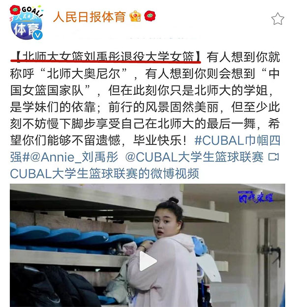 在社交媒体上,刘禹彤也是官宣了自己即将退役大学生涯的决定,在过去的大学时间里面,刘禹彤三次带领北京师范大学获得WCUBA的冠军,可惜的是在22-23赛季,刘禹彤所带领的的球队没有能够进入4强,而在最后一次以大学生球员身份参加完大运会之后,刘禹彤的大学篮球生涯也正式结束,她也是官宣退役大学女篮。