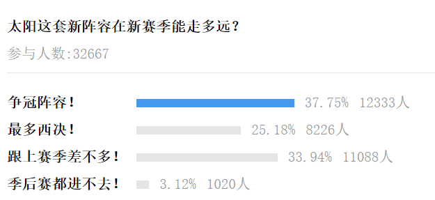 这支拥有多名巨星的太阳目标只有一个,拿下队史首冠,那么说他们会在下个赛季取得成功吗?有媒体发起投票,称新赛季的太阳会走多远呢?根据数据显示,认为可以争冠,看好的占比37%左右,觉得和上个赛季差不多的有33%左右,可以说是两极分化比较严重。