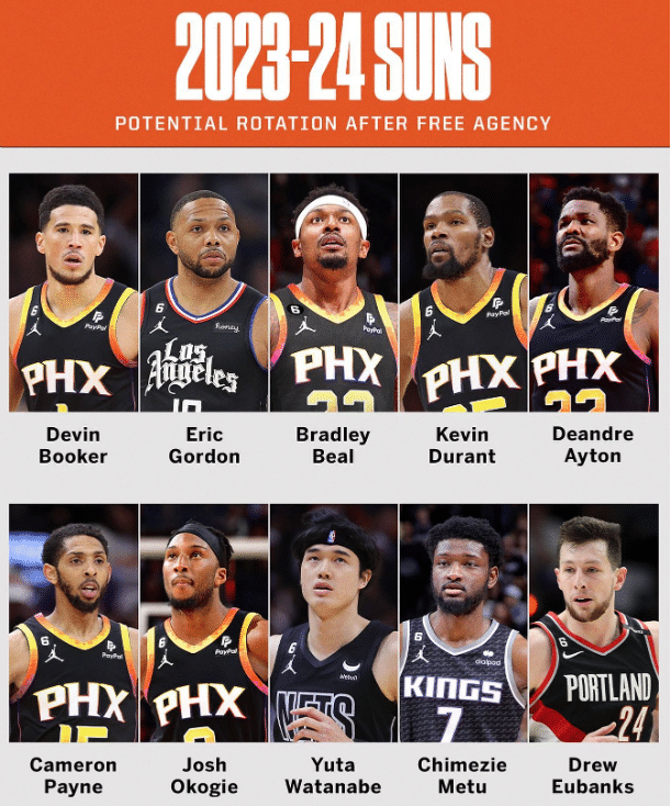 对于太阳来说,上个赛季交易得到杜兰特,组建四巨头,当时就有很多人看衰,虽然得到巨星,但球队的防守体系被打破,板凳厚度也不够。所以到了休赛期,太阳连续签下尤班克斯、迪奥普、渡边雄太、塔克和梅图,并与李和奥科吉完成了续约。