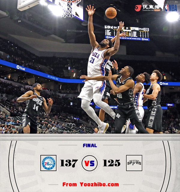 24直播网2月4日讯 NBA常规赛,76人客场挑战马刺。76人东部第三,马刺西部倒数第二。哈登落选了全明星替补阵容。比赛开始,76人连续出现失误,但随后及时调整,76人内外开花连续拿分,马刺不断冲击内线得手还以颜色。76人连造杀伤取得优势,哈登恩比德联手将分差拉开到两位数,半场战罢76人73-62领先。易边再战,双方围绕10分左右的分差展开激烈争夺,马刺依旧频繁攻击篮筐拿分,76人连中三分将优势扩大到20分,马刺努力追赶但为时已晚,最终,76人击败马刺,送给对手8连败。