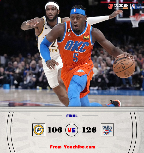 24直播网1月19日讯 NBA常规赛,雷霆主场迎战步行者。雷霆3连胜西部第十,步行者4连败东部第八。上半场,雷霆先发制人,多点开花打出17-1的完美开局,步行者逐渐进入状态,里突外投不断迫近比分,马瑟林三分命中后分差只剩6分,多特高效输出带队保持优势,半场战罢雷霆58-44领先。下半场,雷霆火力全开,步行者无力招架,雷霆多点开花将分差拉开到25分以上,过大的分差让比赛早早失去悬念,最终,雷霆轻取步行者,取得4连胜。
