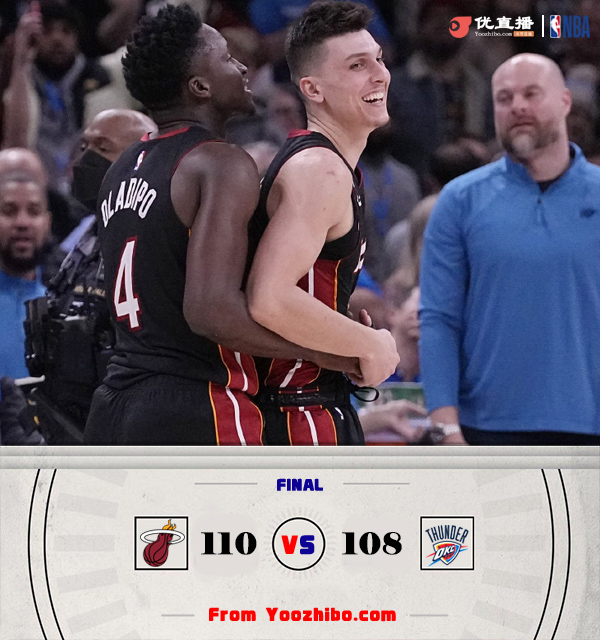 24直播网12月15日讯 NBA常规赛激战正酣,热火和雷霆正面对话,热火上场取胜后战绩来到13胜15负,目前位列东部第10位,雷霆近期遭遇三连败,目前排在西部第13位。此役一上来双方迅速找到节奏,亚历山大联手多特不断取分,热火则多点开花及时回应,双方你来我往难分难解,首节结束时两队战成31平,次节回来,希罗突然爆发单节砍下14分,热火中段轰出23-4进攻高潮一举奠定优势,末段雷霆回敬12-3攻击波,半场战罢,热火依然领先12分。下半场回来,热火进攻突然停滞,雷霆一波10-0缩小分差,中段热火进攻依然没有起色,雷霆延续火力一度追平,热火连中罚球守住优势,三节结束后热火依然领先2分,末节决战,雷霆一鼓作气实现反超,决胜时刻热火及时回暖重新领先,希罗冷血后仰跳投打进,热火险胜雷霆。