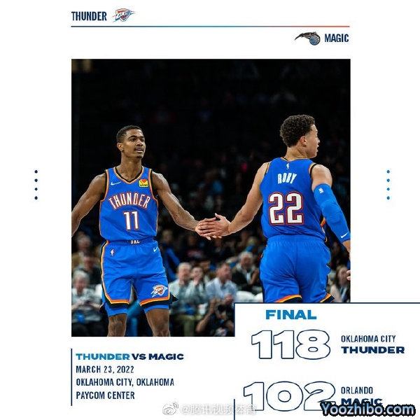 24直播网 3月24日讯 NBA常规赛雷霆对阵魔术,雷霆近来遭遇10连败,魔术则是取得2连胜。开场后魔术外线开张早早建立两位数领先,雷霆逐渐找到进攻节奏,但魔术外线手感火热。第二节上来风云突变,雷霆一波20-2的攻势一举完成反超,此后魔术在小安东尼的带领下稳住阵脚咬住比分,上半场雷霆60-53领先。下半场回来虽然魔术在第三节一度追平比分,但雷霆及时找回状态再度建立优势,最终雷霆118-102击败魔术结束10连败。