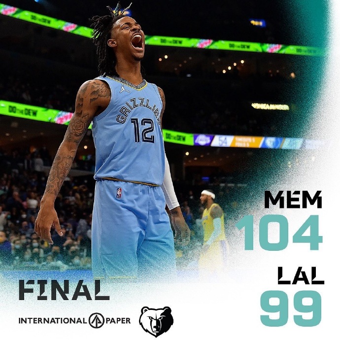 灰熊(22-14):莫兰特41分10篮板2封盖,贝恩20分4篮板,杰克逊15分4篮板3抢断,安德森8分4篮板2助攻,亚当斯4分6篮板,克拉克4分4篮板。
