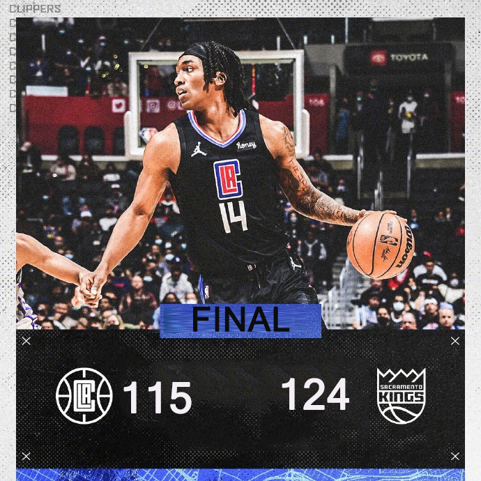 24直播网 12月2日讯 NBA常规赛,快船今日迎战国王,前者遭遇两连败后排在西部第六的位置,后者同样也是两连败排在西部第十一位,本场乔治、巴图姆、巴恩斯和巴格利等人缺战。比赛上来国王就率先进入状态取得领先,虽然雷吉和祖巴茨的出色发挥帮助快船迅速实现了反超,但是整个上半场国王完全占据了场上的主动,分差也是一度达到了二十分,半场结束时快船将比分迫近到仅差10分。易边再战,国王的攻势更盛,第三节单节爆砍37分后将分差扩大到二十分以上,末节快船虽然有追分的势头但为时已晚,最终国王轻取快船,送给后者三连败。