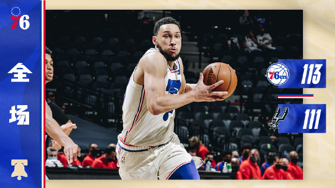 马刺(31-32):沃克23分2助攻,吉昂17分4篮板4助攻2抢断,盖伊18分10篮板2抢断,约翰逊19分6篮板5助攻3抢断,尤班克斯10分6篮板,瓦塞尔4分6篮板,米尔斯6分4篮板4助攻 76人(23-12):格林3分,斯科特11分4篮板4抢断,恩比德24分13篮板5助攻,库里7分5助攻,西蒙斯18分6篮板2助攻2抢断,米尔顿26分4篮板4助攻,科克马兹19分2篮板2助攻,塞布尔4分3助攻,马克西4分2篮板5助攻,霍华德8分6篮板,布拉德利4分,弗格森2分