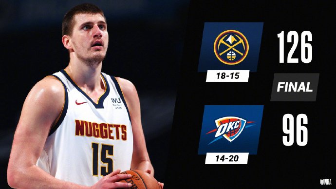 24直播网2月28日讯 掘金今日前往俄城挑战雷霆,双方前两次交锋都以掘金的胜利告终,此役他们也是势在必得。首节比赛,雷霆攻防两端全部掉链子,掘金上来就反客为主奉上13-0的攻击波,波特单节三分4中4砍下14分,在他和约基奇的带领下掘金全队火力全开,很快便确立了18分的领先优势。次节雷霆利用对手主力下场的间隙,靠着杰罗姆、K-威廉姆斯等人的努力一度将分差迫近到11分,但当掘金主力重回场上后,局势再次失控,掘金送出18-5的攻势将分差拉大到22分。第三节雷霆外线依旧失准,防守端霍福德又被约基奇完全压制,约老师两节半即砍下三双,掘金多点开花一举确立了30分的领先优势。末节因为分差过大,两队早早撤下主力开始练兵,比赛彻底失去悬念,最终掘金客场126-96击败雷霆。