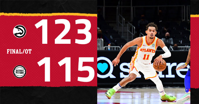 24直播网1月21日讯 NBA常规赛活塞对阵老鹰,开场后两队主攻内线连续打平,此后虽然活塞外线找到手感,不过老鹰也紧咬比分,第二节卡佩拉篮下发挥强势帮助老鹰一度反超比分,不过活塞及时稳住局势仍旧以52-45领先结束上半场。下半场虽然特雷-杨火力全开为老鹰追分,并且他们一度将分差缩小到只差3分,但活塞三节结束前打出一波11-0的高潮将分差拉大到两位数,第四节两队进攻都手感不佳,特雷-杨在最后时刻连续制造犯规犯规追分并且助攻卡佩拉空接扳平比分,两队进入加时大战。加时赛中老鹰发挥更胜一筹,最终老鹰加时123-115逆转活塞。