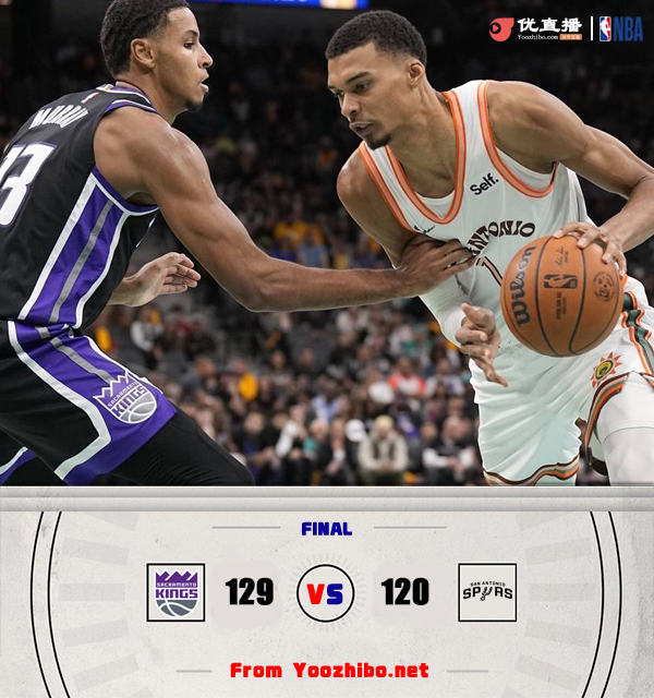 24直播网11月18日讯 NBA常规赛西部季中锦标赛C组,马刺主场迎战国王。马刺近况不佳遭遇6连败,国王则是4连胜。比赛开始,马刺开场火力全开,内外开花轰出23-5的完美开局,但此后命中率骤降,国王奋力反击连中三分,多点开花完成26-7的进攻高潮强势反超,此后双方陷入缠斗,比分交替领先,半场战罢双方战成62平。易边再战,双方继续对攻,比分始终紧咬,末节双方争夺陷入白热化,关键时刻国王一波7-0确立优势,马刺苦苦追赶无果,最终,国王129-120力克马刺,取得5连胜的同时送给对手7连败。