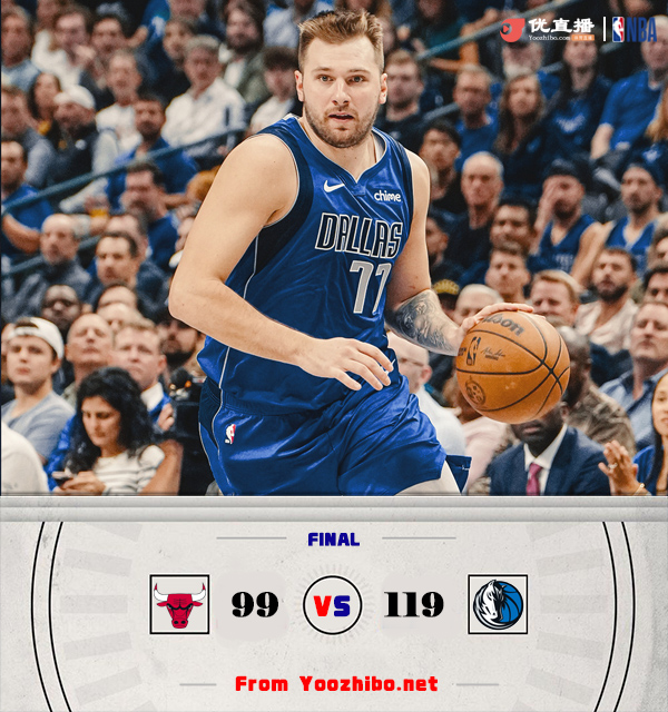 24直播网讯 北京时间11月7日讯 NBA常规赛,独行侠主场迎战公牛,独行侠目前4胜3负,公牛则是2连败后3胜4负,本场比赛华盛顿不打。比赛开始,公牛进攻端就状态一般,武切维奇内线苦苦支撑,欧文大杀四方首节砍下15分,东契奇连续送助攻,首节独行侠建立8分领先,次节双方展开拉锯战,基迪和武切维奇还是支撑起公牛进攻,加福德接连吃饼,东契奇还是打得很合理,独行侠半场领先到11分。下半场,公牛进攻端突然断电,独行侠一波13-0超级攻击波直接拉开20分以上领先,公牛依靠外线追分,但东契奇继续控场,三节独行侠领先到20分,末节独行侠7-2继续拉大比分,随后双方逐渐换上替补练兵,最终独行侠119-99轻取公牛,送对手3连败。