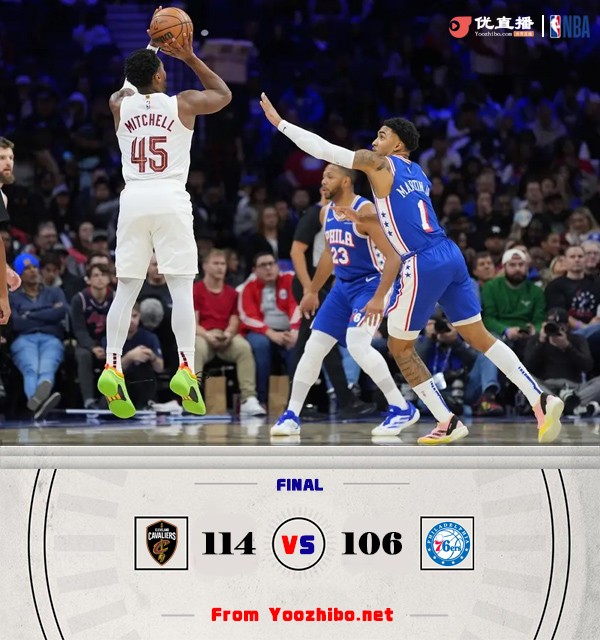 24直播网11月14日讯 NBA常规赛继续开打,76人今日坐镇主场迎战骑士,上一场复出的恩比德没有出战背靠背比赛,他和乔治一同缺席本场比赛。76人虽然三位核心全部缺阵阵容不整,但上半场争夺他们不落下风一直和骑士对攻,次节他们抓住轮换机会以17-5开局反超比分占据上风,骑士这一节都没能打出有效攻势单节仅得17分并带着6分劣势进入下半场。休息归来骑士找回领头羊的状态并以24-12的攻势迅速夺回主动权;随后拉锯战骑士一直维持着微弱优势,最后时刻米切尔连续三记三分杀人诛心为球队奠定胜局。最终,骑士击败76人豪取13连胜并延续赛季不败战绩。