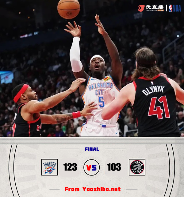 24直播网3月23日讯 NBA常规赛,雷霆客场挑战奇才。雷霆西部第一,猛龙8连败排东部倒数第四。比赛开始,猛龙率先发力,内外开花打出11-2取得两位数优势,雷霆连投带罚努力追赶,次节猛龙突然断电,雷霆奋力反击轰出21-4的进攻狂潮强势反超并一度获得10分优势,半场战罢雷霆63-56领先猛龙。易边再战,雷霆牢牢占据场上主动,始终保持10分左右领先,末节雷霆持续发力扩大领先,猛龙大势已去无力回天。最终,雷霆123-103轻取猛龙,送给对手9连败。