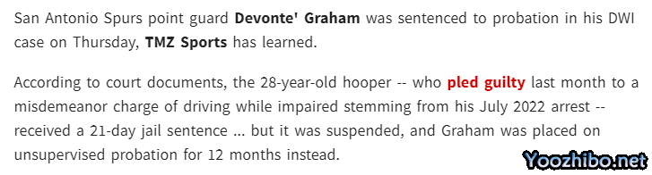 根据法庭文件,格拉汉姆承认了自己在去年7月酒驾的轻罪指控,被判21天监禁,无监督缓刑12个月,还需支付393美元的罚款和相关费用。