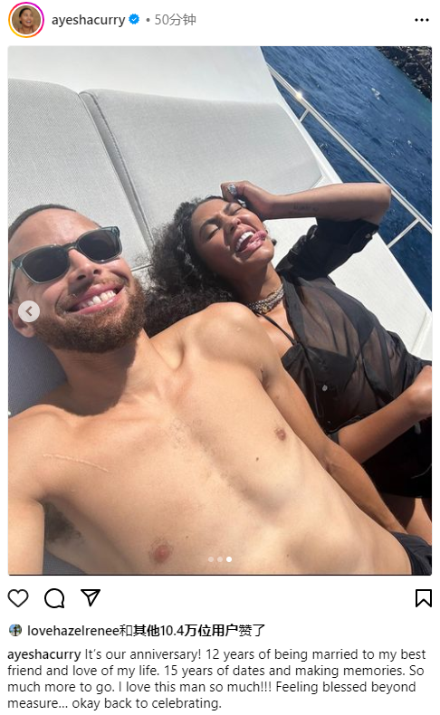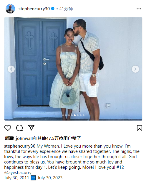 库里晒度假合影,并且写道:我的女人。我爱你胜过你所知道的。我感谢我们一起分享的每一次经历。高潮,低谷,生活让我们在这一切中更加亲密。上帝继续祝福我们。从第一天起,你就给我带来了如此多的欢乐和幸福。让我们继续前进。我爱你@阿耶莎#12,从2011年7月31日到2023年7月31日。