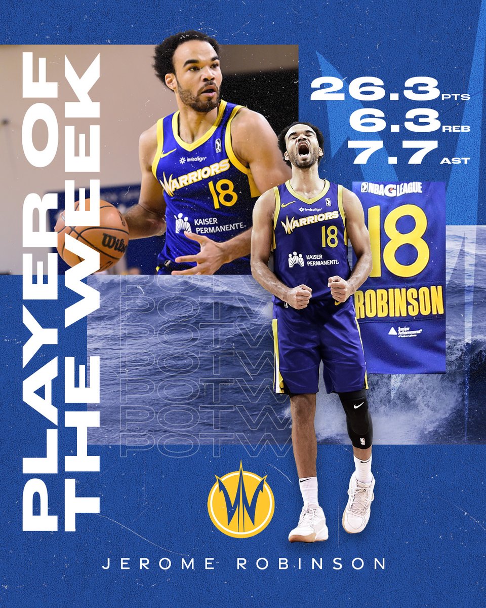 杰罗姆-罗宾逊是2018年首轮13号秀,今年26岁,司职得分后卫,身高1米93、体重86公斤;去年夏天罗宾逊曾为勇士出战3场季前赛,场均上场11.3分钟,得到5.7分2.3篮板,之后他一直在发展联盟打比赛,夺得过G联赛的周最佳球员。