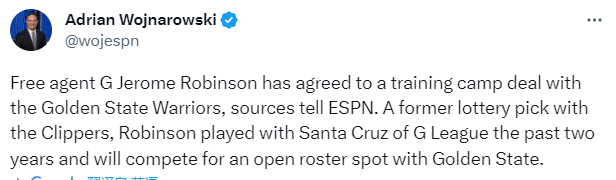 来源:24直播网07-18 12:2624直播网讯07月18日,据espn名记woj报道,NBA自由球员杰罗姆-罗宾逊已同意与金州勇士队达成训练营协议,他将争夺勇士队的一个空缺名额;罗宾逊曾是快船队的乐透秀,过去两年效力于勇士发展联盟的圣克鲁兹队。