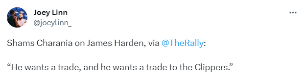 名记重申哈登一心只想加盟快船,而且哈登与76人管理层之间的关系已经破裂,双方彻底决裂;若在训练营之前没有被76人交易,哈登将将会十分不满;哈登已经下定了离队的决心,即使恩比德和贝弗利曾公开喊话希望他留下来,哈登仍坚持要走。
