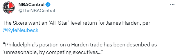 76人对哈登的要价被竞争对手的高管描述为“不合理”,而76人则驳斥了这一观点——76人认为交易哈登可以有两种方案——其一是换回一些能让他们保持在同一级别竞争中的球员,其二是得到足够的资产去追求另一个高水平的球员。