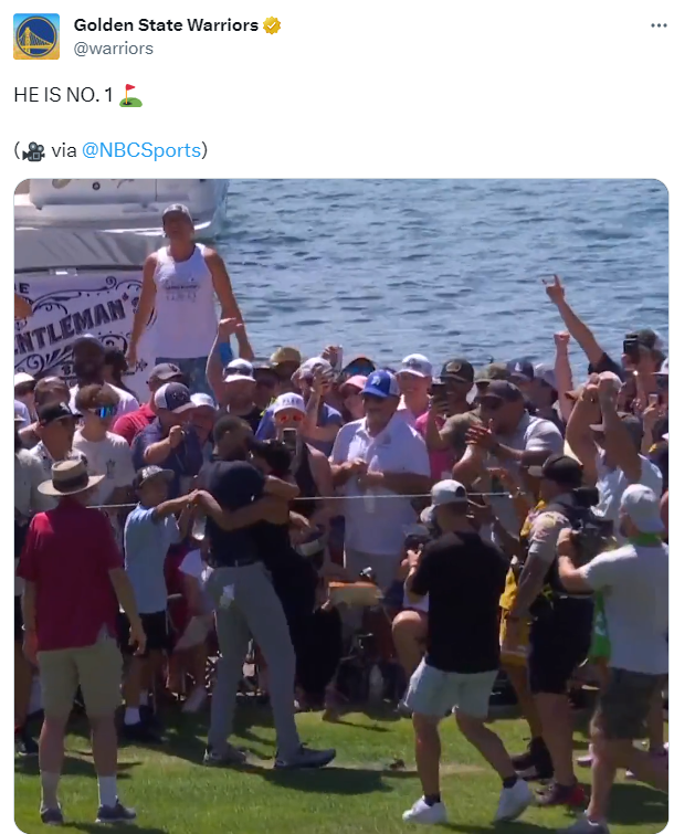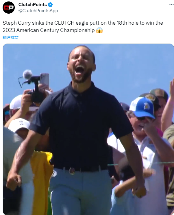 在美国高尔夫世纪锦标赛上,随着库里推杆进洞完成老鹰球,他正式夺得该赛事2023年的冠军,也是第34届该赛事的冠军;库里夺冠后把帽子扔向天空,一路奔袭、双手握拳怒吼庆祝,拥抱爱妻阿耶莎,后者顺势抬起双脚,直接趴在库里的怀中;现场观众也为库里欢呼。