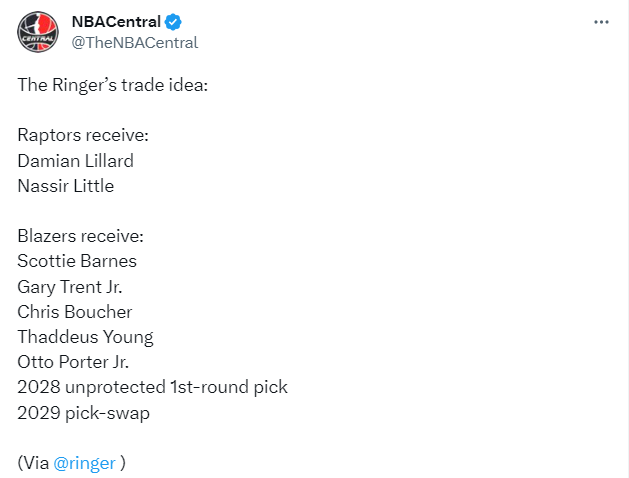 美媒The Ringer列出关于利拉德的2换7交易方案——开拓者送出利拉德、利特尔,从猛龙得到斯科蒂-巴恩斯、小特伦特、布歇、赛迪斯-杨、奥托-波特、2028年非保护首轮签、2029年选秀签互换权。