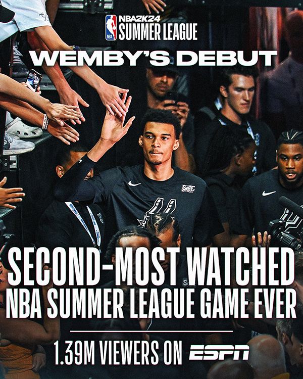 据NBA官方统计,在上周六马刺和黄蜂的比赛中,文班亚马迎来夏联首秀,本场比赛的收视率创赌城夏联历史第二高,这也是赌城夏联史上收视率最高的揭幕日。