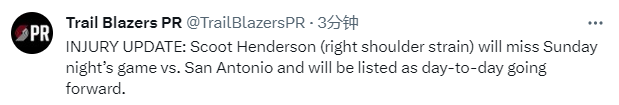 接受核磁共振检查后,亨德森的伤情确诊为右肩扭伤,所幸没有遭遇肩膀脱位或者半脱位的重伤,因伤缺席下一场与马刺的比赛,能否出战其他的夏联比赛成疑。
