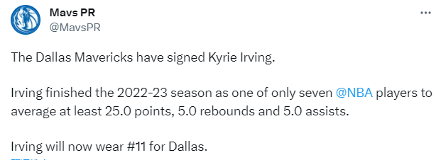 22-23赛季,欧文身穿2号球衣为独行侠出战20场常规赛,场均拿到27分5篮板6篮板,欧文和东契奇合作的第一个赛季以失败而结束。