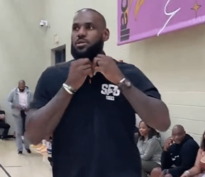 38岁詹姆斯身穿酒红色短裤和黑色Polo衫,来到球馆后先和友人击掌拥抱,并且满脸笑容十分开心;詹姆斯扭头后一脸严肃,光速变脸,系着纽扣走上球场,布莱斯的队友们都鼓掌欢迎老詹。