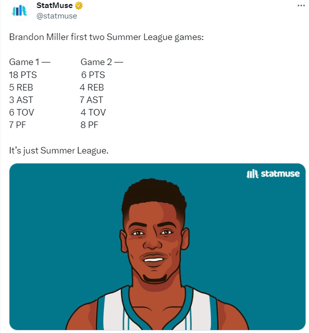 今日黄蜂输给勇士,布兰登-米勒出战28分钟,投篮4中2,三分2中1,罚球1中1,仅得到6分4篮板7助攻1抢断,还有4失误8犯规,正负值-22;今日一战,米勒前三节0分4失误6犯规,末节米勒又是垃圾时间刷分,即使如此,当米勒打进个人本场首球时,现场球迷仍旧鼓掌鼓励他。