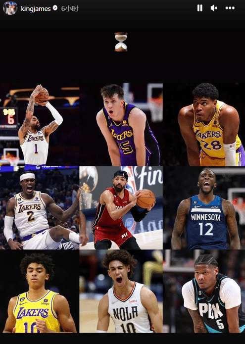 不久前,詹姆斯再次晒照欢迎新队友加盟(文森特、普林斯、雷迪什和海斯)和老队友(拉塞尔、八村垒、里夫斯、范德彪)回归,配文沙漏表情;老詹如此操作相当于为湖人提前官宣签约。