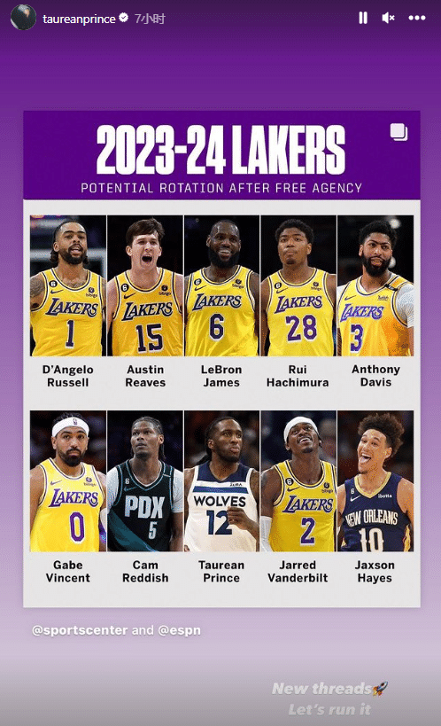 湖人新援托里恩-普林斯转发媒体总结的湖人新赛季主要轮换阵容照,并写道:新的球衣,让我们加油!