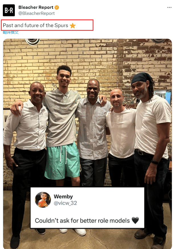 美媒疯狂转发如此罕见的合影;BR配文写道:马刺的过去和未来;马刺队史三大状元都来了,马刺官方转发文班亚马的动态,配文写的:哭了。