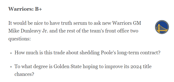勇士进行这笔交易的目的有两个,一是摆脱普尔的长期合同,二是提升2024年冲冠的机会。球场上,保罗能解决勇士最大的弱点:只要两届MVP库里坐在板凳席上时,他们的进攻就会陷入困境。2022-23赛季常规赛,库里不在场时,勇士的进攻百回合只得到110.4分,是联盟倒数前五的水平,而季后赛库里不在场时,勇士的进攻效率下滑到令人难以置信的89.4(百回合只能得到89.4分)。