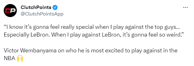 谈到进入NBA后对上谁会最感兴奋,文班亚马说:我知道,等我对上那些顶级球员们,感觉会非常特别。特别是勒布朗-詹姆斯,等我对阵詹姆斯时,那感觉会非常奇怪。