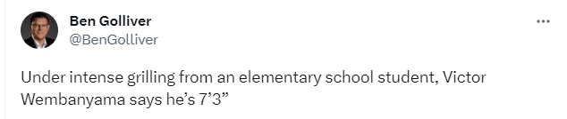 NBA选秀前夕,文班亚马参加了一系列活动,在和小朋友的互动时有一位小朋友激烈拷问文班亚马的身高问题,文班亚马表示他的身高是7尺3(约2米21)。