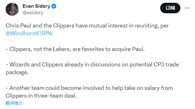 Windhorst在节目中表示,保罗和快船对重聚互用兴趣,快船(不是湖人)获得保罗的最爱,奇才和快船已经在讨论潜在的CP3交易方案。