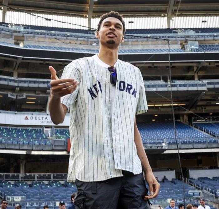 由于法甲季后赛已经结束,文班亚马无缘带队夺冠,现在他已经来到美国纽约,今天文班亚马来到洋基队主场,身穿5号并且为洋基队开球,第一球明显扔得太歪。