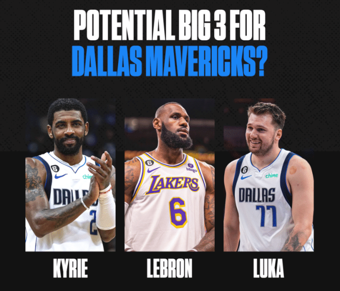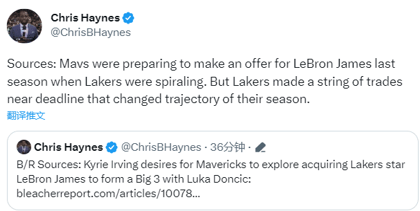 据名记Chris Haynes报道,欧文希望独行侠能交易得到詹姆斯,与他和东契奇组成超级三巨头;名记Shams跟进报道,欧文已经联系了詹姆斯,他想知道詹姆斯是否会来达拉斯,来为独行侠效力。